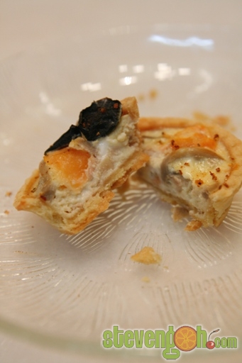The Quiche was made of tuna, mayo, mushroom slices, tomato slices and some pickled olives on top.