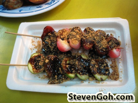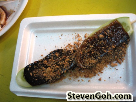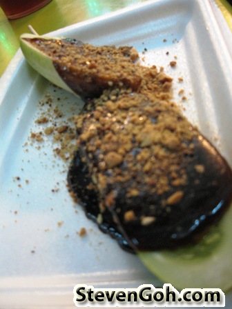 The first order was white turnips (mengkuang) and pineapple slices which had been arranged like a pizza. I was surprised as usually rojak is mixed in a plate or a bowl. Anyhow, according to Criz this is a better way of having rojak. If it was mixed in a bowl/ plate together with shrimp paste dressing, the dressing will be come diluted from moisture released by the fruits. Therefore this is better way to taste out rojak.