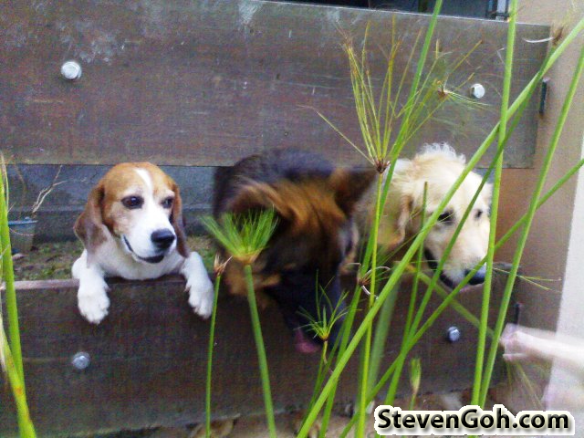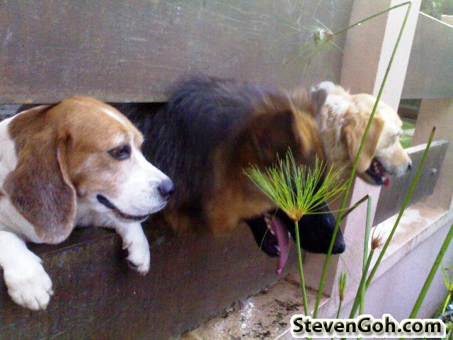 (From Left) The shortest of all Bianca (a Beagle), a not-too-fierce-looking Harvey or Hardy?? (a German Shephard) and cuddly Ralph (a Golden Retriever).