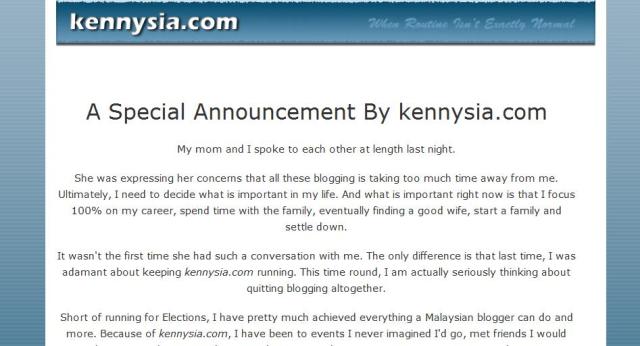 What a shocking announcement! I’ve never thought that this will happen to Kenny Sia, I thought that his side income earned from blogging can actually overtake his main income and he got so many comments every day that can make him busier in his blog. Anyhow, I am wrong. It seems that Kenny Sia has come to an end, and he is now a legend.