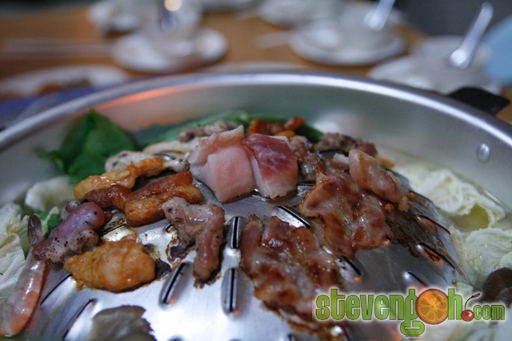 All the items that can be barbecued will be placed on top of the dome-shaped grill whereas items such as vegetables can be dipped into the edge of the pan which contained tasty broth. Compared to other Thai Style Barbecue Steamboat, the broth did not contain MSG and was naturally sweet. This is due to the broth was cooked with veggie, chicken stock and some rock sugar.