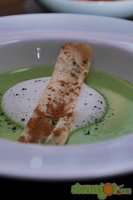 GREEN PEA CAPPUCCINO – RM11, the soup was cooked with blended green peas, then topped with Parmesan nutmeg foam and cinnamon lavosh.
