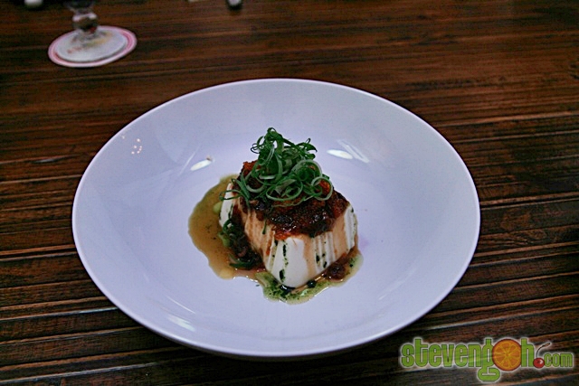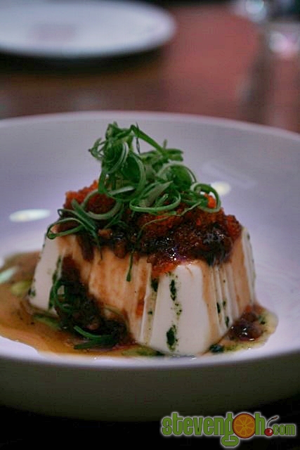CHILLED SILKEN TOFU – RM12, the chilled homemade tofu was topped with caviar, dried shrimp, hoisin paste and chives.