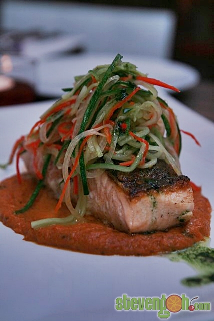 PAN SEARED SALMON – RM30, the pan fried salmon was served with laksa cream, pickled cucumber, mint salad, and fermented prawn foam.