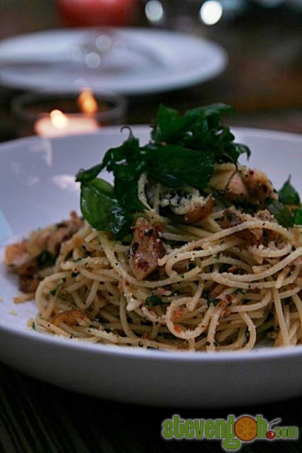 FIVE SPICE ROAST PORK AGLIO OLIO – RM22, the spaghetti was stir fried with crispy roast pork, Thai basil and chili flakes.