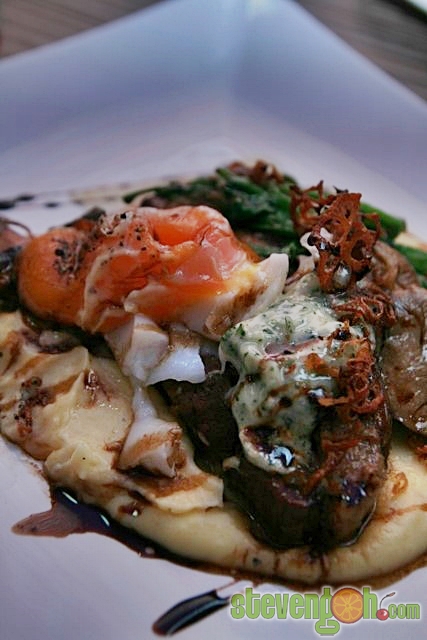 BRAISED PORK BELLY – RM28, the braised pork belly was served with grilled abalone mushroom, garlic spinach aioli, confit potatoes, poached duck eggs.