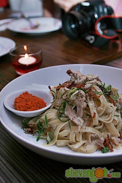 COCONUT AND GINGER CARBONARA FETTUCCINI – RM24, the fettuccini was cooked with coconut milk, ginger and pandan leaf cream. Serving together with this dish were poached Hainanese chicken, crispy chicken skin and garlic sambal.