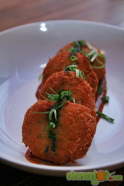 CRAB AND CORN CAKES (3) – RM16, The crab meat was mixed with corn and made into deep-fried cakes. It was served with Singapore spicy chili sauce and arugula salad. The serving should be for 3 instead of 4.