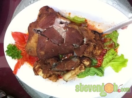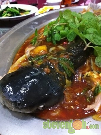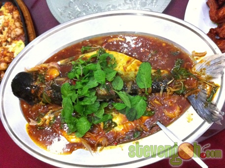 Pa Din Fish – RM92, Pa Din fish is a kind of river fish. For this dish it was used to steam with sweet, sourish and spicy sauce, then covered with onion slices, chili slices and sprinkled with mint leaves.
