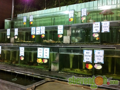 The aquariums with various sea creatures at the back of the restaurant.