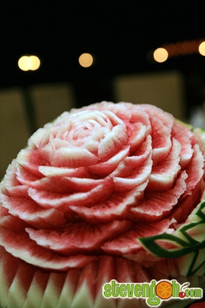 The carving of the watermelon that looks like a huge rose flower. It looks so delicious, but it is for display purpose only.