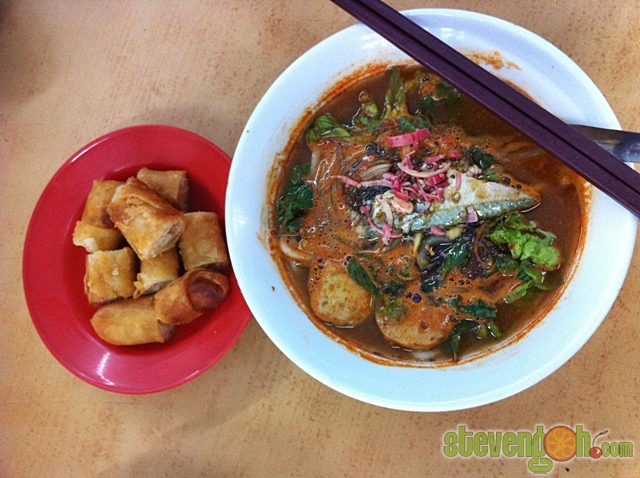 The serving of a bowl of laksa will come with crispy spring roll.