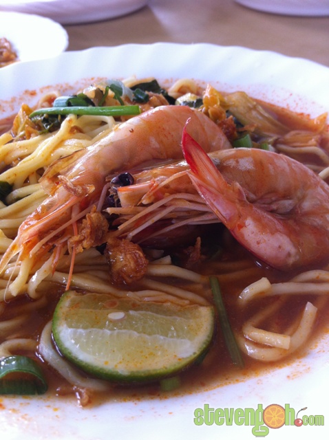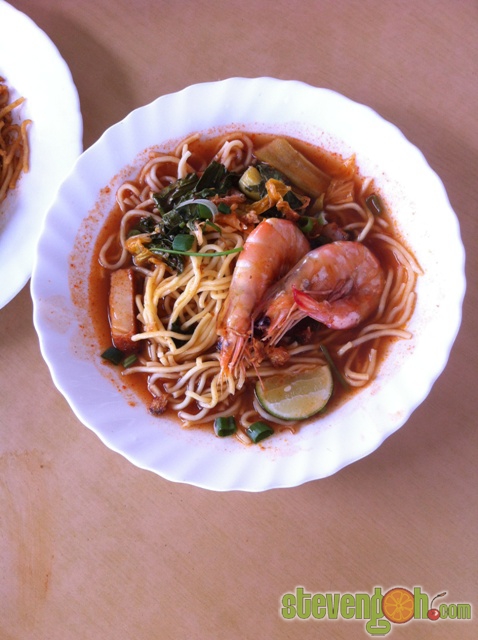 Prawn Soup Noodle – RM6-RM10. Most of the ingredients for soup noodle are the same as fried prawn noodle which consist of yellow noodle, spring onions, veggie, fish cakes, chilies and 2 big prawns. The only difference is that the way of cooking, which is served in soup instead of stir-fry.