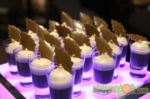 Black & White Chocolate Mousse in Glass, for this dessert, the combination of dark and white chocolate mousse was mixed together in a glass, then topped with a chocolate flower bud which looked like the fruit of cocoa.