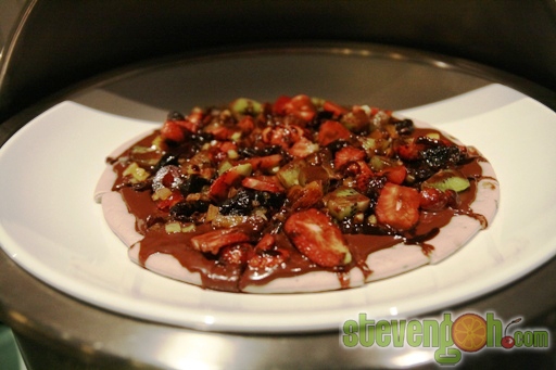 Chocolate Fruit Pizza, this is a new invention. The bread was topped with fruits and olives then covered with chocolate spread. This is something different than our usual Hawaiian chicken or tuna pizza.