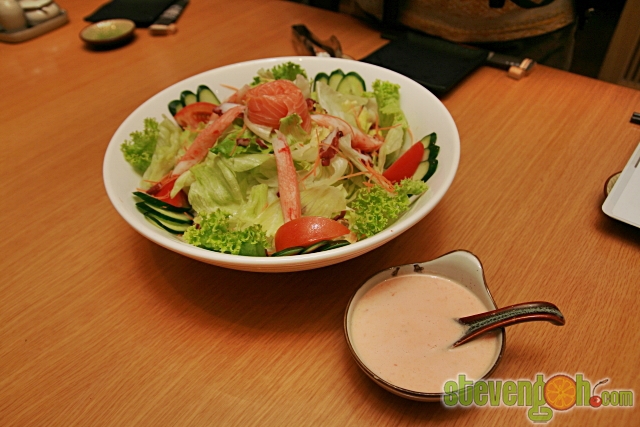 Miraku Salad – RM18 (Small), RM23 (Medium), RM28 (Large), the salad is made of zucchini slices, octopus, scallops, lettuces, tomato slices, carrot slices, crab sticks and salmon slices. There are 4 additional toppings available: Tomato, Wafu, Sesame, Mayonnaise. Each for RM3.