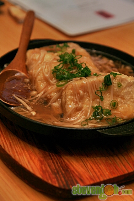 Tofu Steak – RM14, Pan-fried tofu with thick sauce on hot plate.