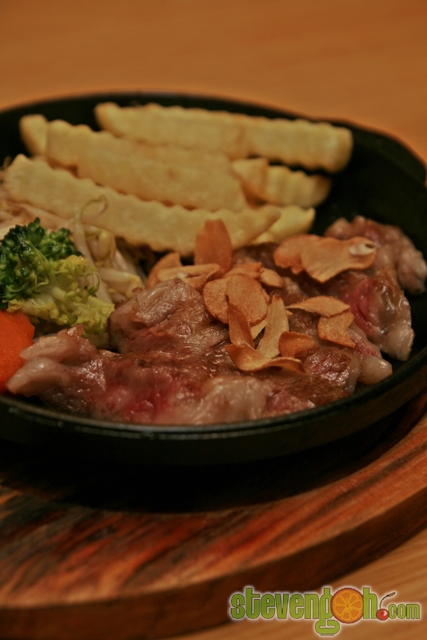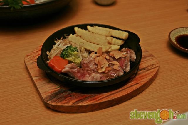 Kobe Beef Steak RM200 /100gm, the Kobe wagyu beef slices were grilled and served in a hot plate, together with the dish were fries, bean sprouts, broccoli and carrot slices. On top of the kobe wagyu slices were fried garlic slices.