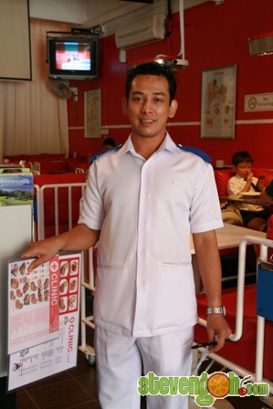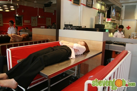 Warning to kids, please do not follow the dangerous act below. Below stunt had been practicing for a long time and we had sought approval from the President of the Clinic to perform so. The lady on the picture below was acting like a patient and slept on top of the table to allow us to take a good shot of photo. She is the first lady customer to have done so in Clinic Cafe.