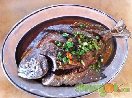 Deep Fried Black Pomfret with Soy Sauce – RM25, The black pomfret was first deep fried and it was then covered with some soy sauce and oil. It was then sprinkled with some chopped bird eye chili for some flavoring. The texture of the fish was crispy on the outside and soft on the inside. The aroma of fresh fish could be felt the moment you peeled the meat. The preparation of this dish was very simple, yet the taste was so nice.
