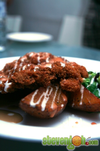 Coffee Chicken Chop – RM13.90, this dish is a fusion western style. The batter had been mixed with some coffee powder and applied on to the chicken thigh before it was brought to the pan to be deep fried. It was placed on top of potato wedges, roman lettuce and pickled olive slices. It was then served together with some mayonnaise sauce.