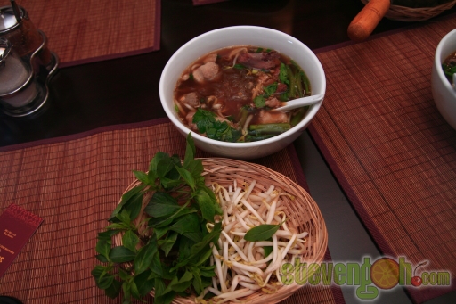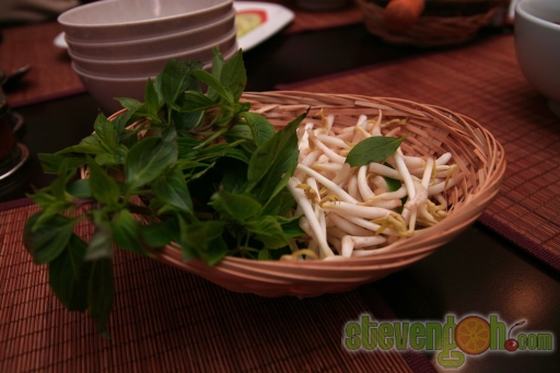 The Thai basil leaves and the bean sprouts are to be placed on the bowl of hot beef noodle soup. The aroma of the Thai basil leaves were strong enough to cover the scent of the beef, whereas the fresh bean sprouts gave a juicy bite.